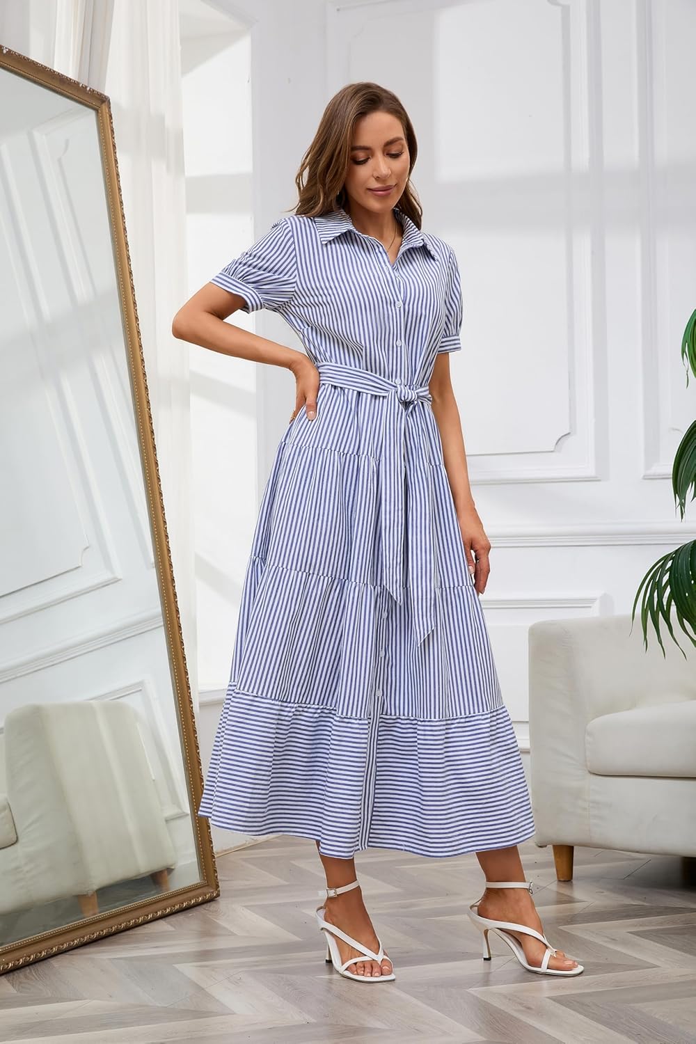 Womens Casual Short Sleeve Button Down Tie Waist Ruffled Striped Maxi Shirt Dress(Buy 2 Free Shipping)